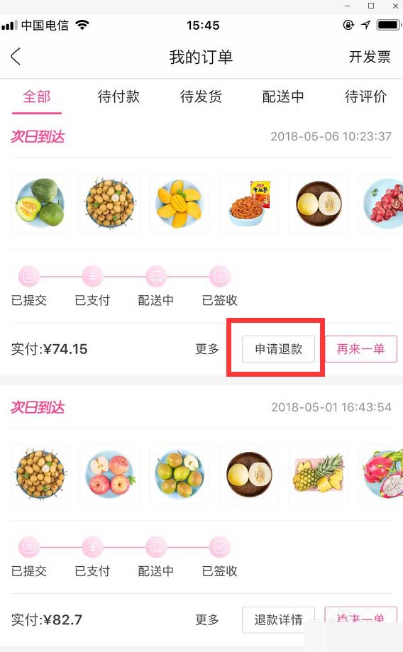 3、选择买到坏水果的那一单,点击【申请退款】进入。
