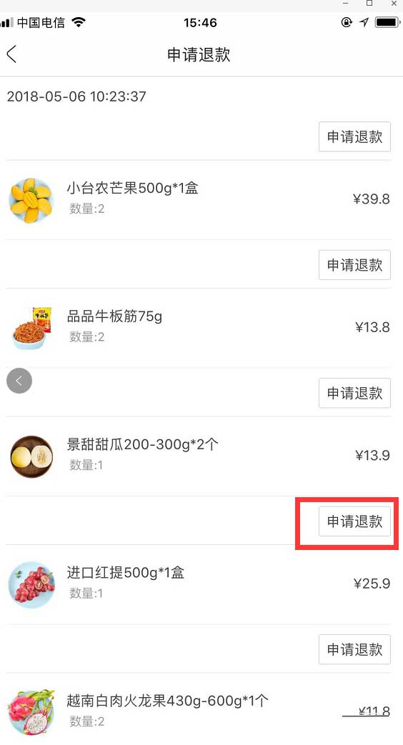 4、选择出现问题的水果,点击【申请退款】。