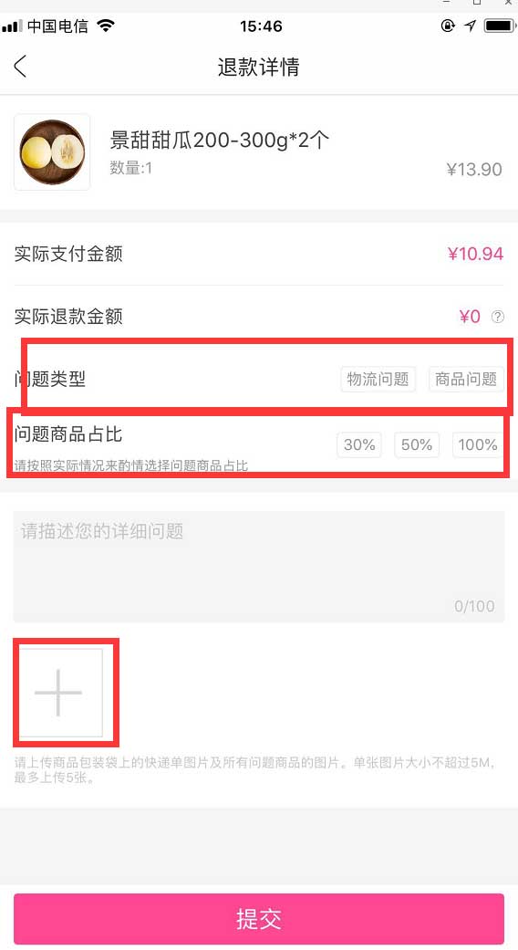 5、填写我标红的三个地方,问题商品占比是指:如果你买了2个香瓜,其中一个坏了,那么问题水果占比就是50%,2个水果都坏了就是占比100%,以此类推。照片处至少拍运单号和坏水果的照片提交。