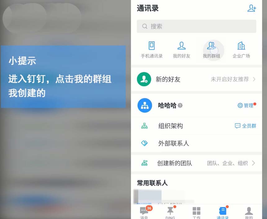 1、首先打开钉钉客户端,进入钉钉“通讯录”,点击“我的群组”,再点击“我创建的”。