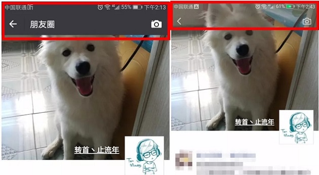 在微信6.6.7内测版中,将原本黑漆漆的朋友圈顶部状态栏变成了透明的,一体感更强,更美观了,如下图所示。