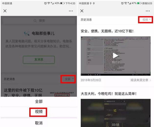 同时,查看微信公众号历史消息时,还以选择看全部文章还是单独查看视频,如下图所示。