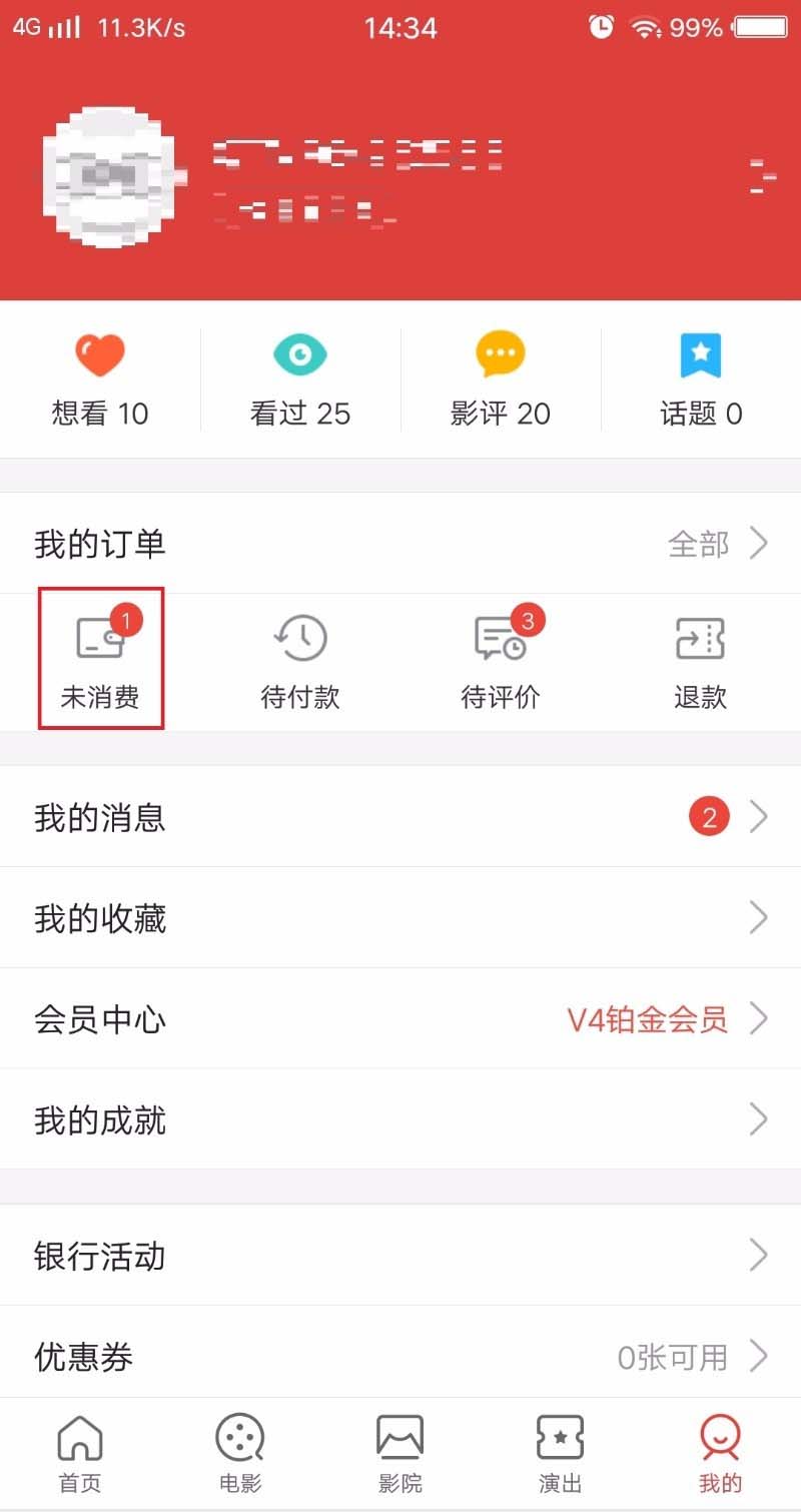 5、退票流程,在个人中心中,选择未消费,在未消费的订单下滑到最后,即可看到退票的入口,由于小编购买的影票是不可以退的,所以标注的是该场次不可退票