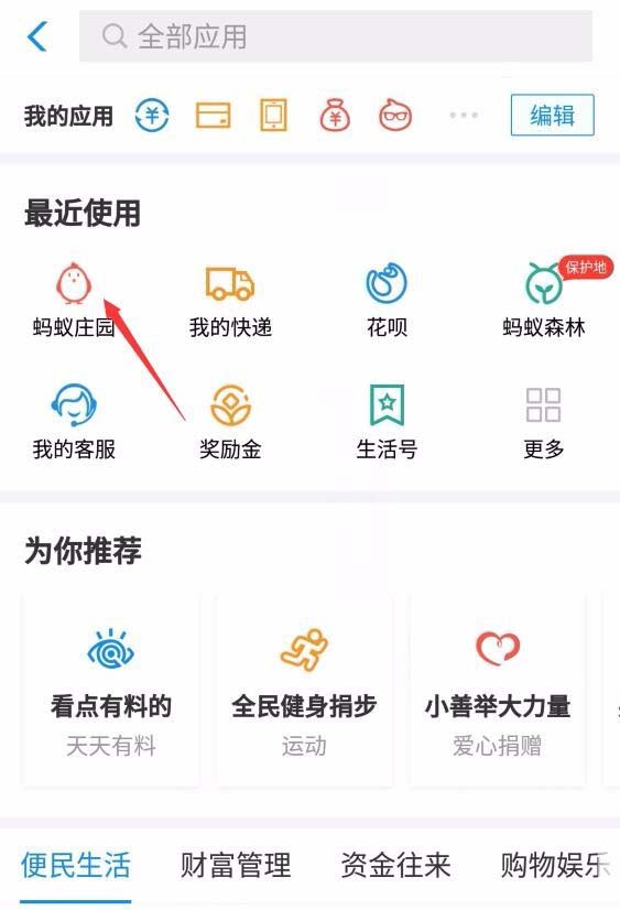 2、然后就会进入到应用面板,此时我们找到“蚂蚁庄园”选项,然后单击该选项。