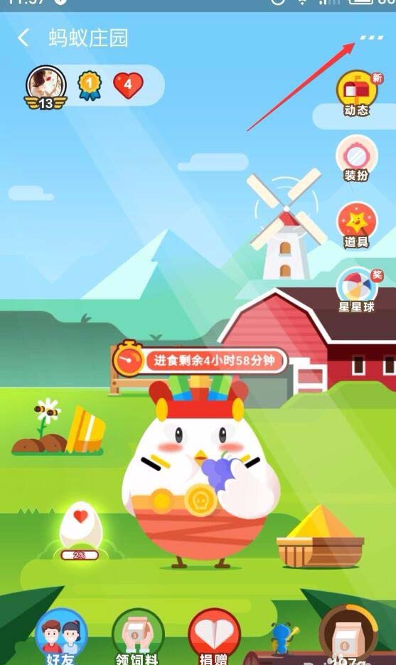 3、单击之后就会进入到蚂蚁庄园主面板,此时在该面板的右上角有一个三点的图标,单击该图标。