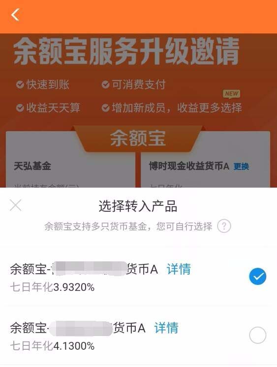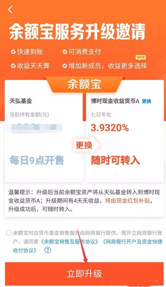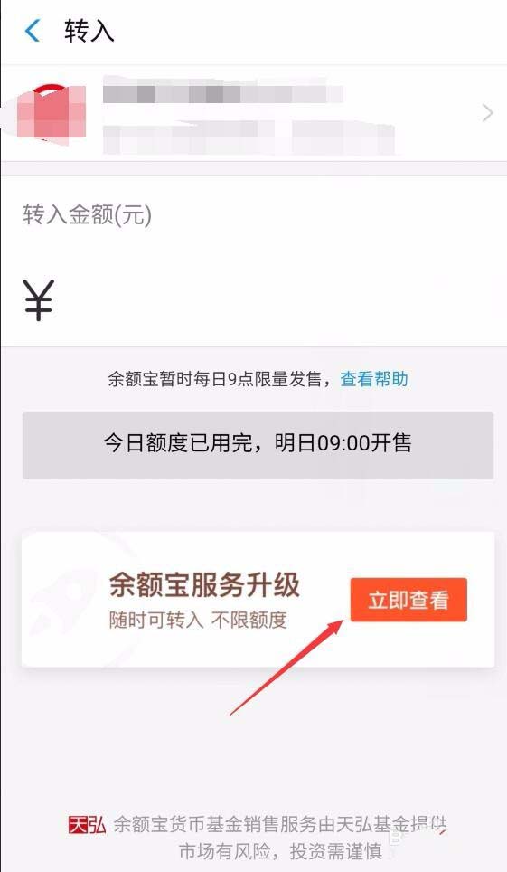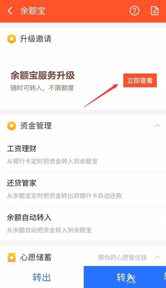 7、有时候在余额宝转入模块,也可以看到升级提醒。