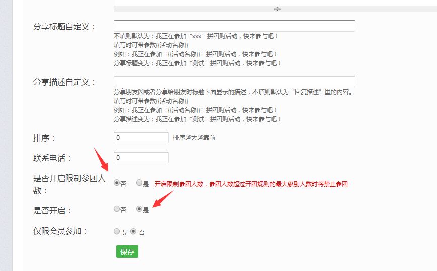 第三步、设置开团规则,填写人数和对应的折扣、填写商品详细、团购说明,根据自己的需要设置是否需要限制参团人数,最后开启活动保存。