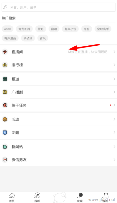 1、若是想要在猫耳fm中开通直播功能,那么用户就需要先点击页面下方的“发现”功能,进入发现页面中进行设置。