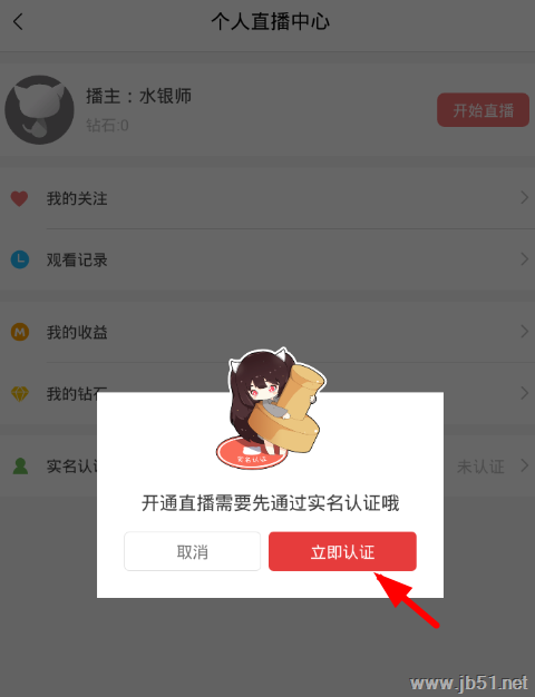 5、不过开通直播的话是需要实名认证的,还没进行认证的话,就点击“立即认证”按钮去进行身份认证吧!