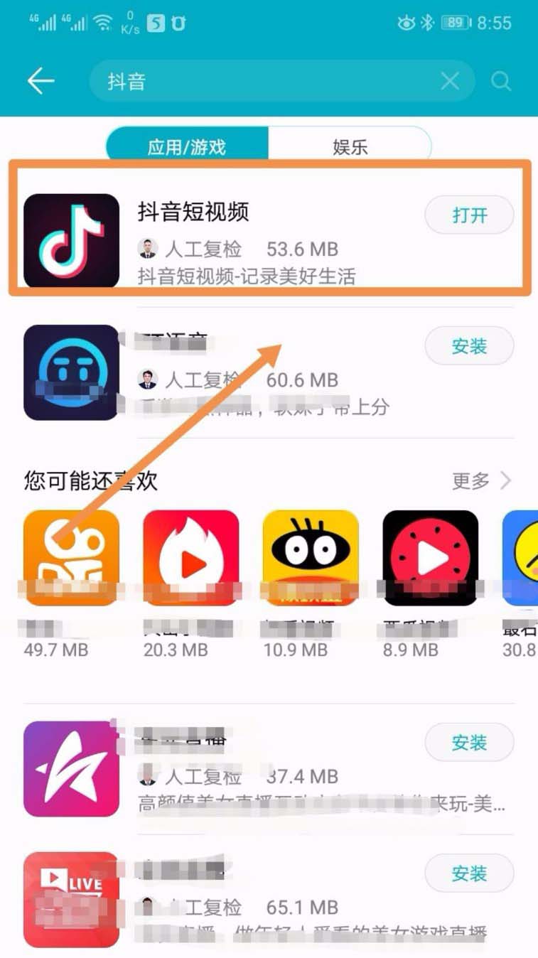 1、我们打开手机的应用商店,搜索“抖音”,下载并安装该软件。