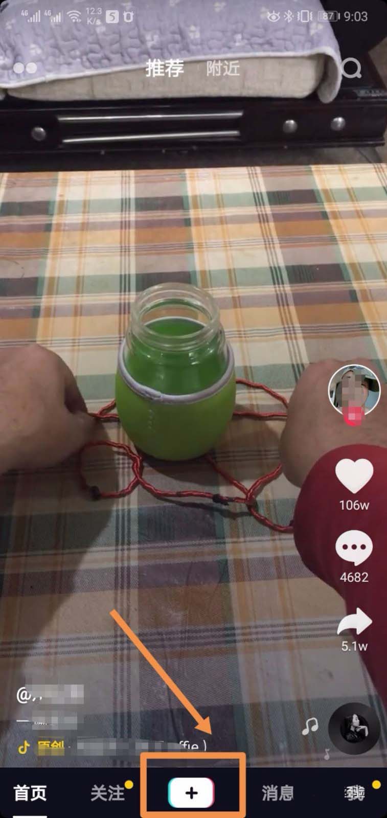 3、登录成功后,可以看到抖音的视频,同时在下方的菜单中我们点击“+”号图标,进行音乐选择界面。