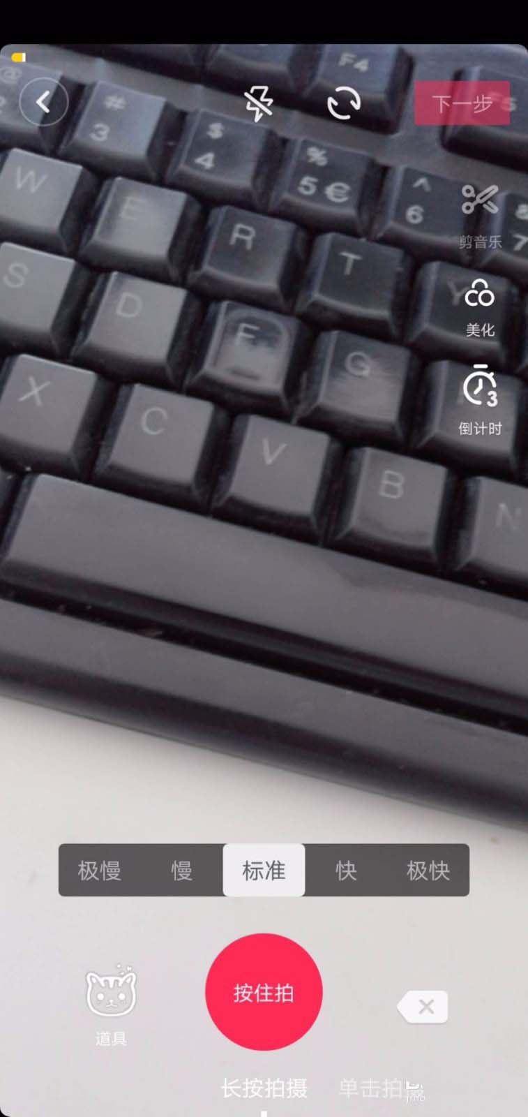 5、点击后进入拍摄界面,长按最下方的“按住拍”,然后开始拍摄视频。拍摄完毕后,点击右上角的“下一步”。