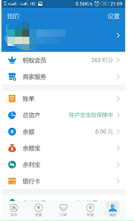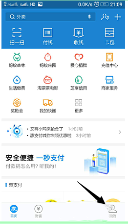 2、在支付宝首页,点击“我的”,进入个人页面。