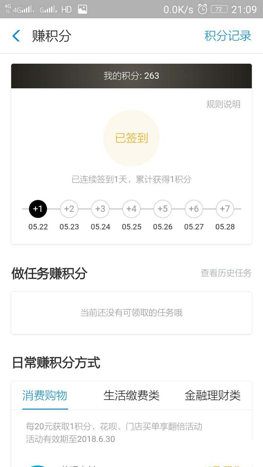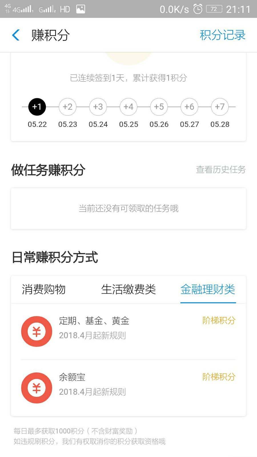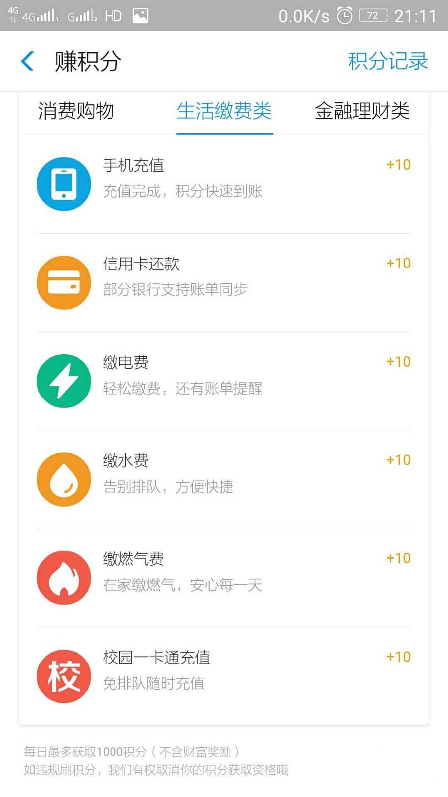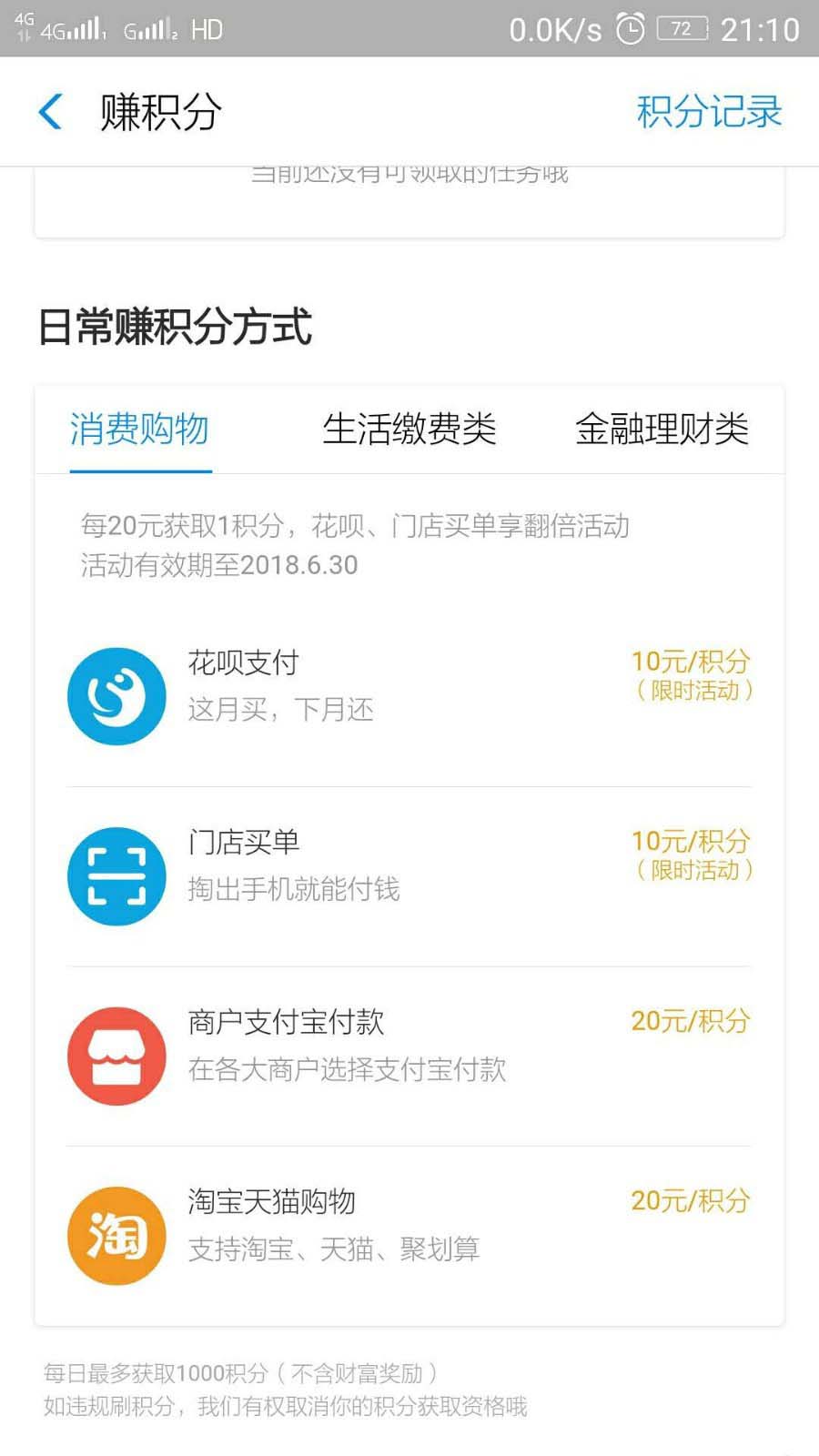 4、其他积分获取方式,如消费购物,生活缴费,金融理财等,都能获得相应的积分。