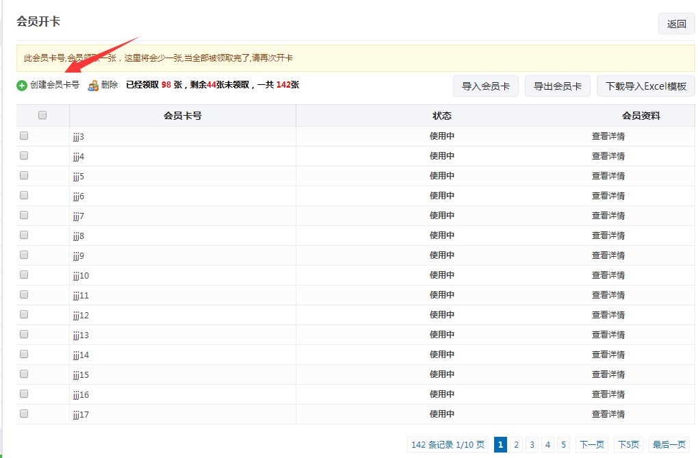 第三步:保存设置之后,进行设置会员卡数量和卡号,点会员开卡-创建会员卡,填写卡号编号,卡号生成范围即会员卡的数量,保存即可。回到会员卡管理页面,点会员卡管理,就会到所有会员的信息、积分信、消费记录、充值记录