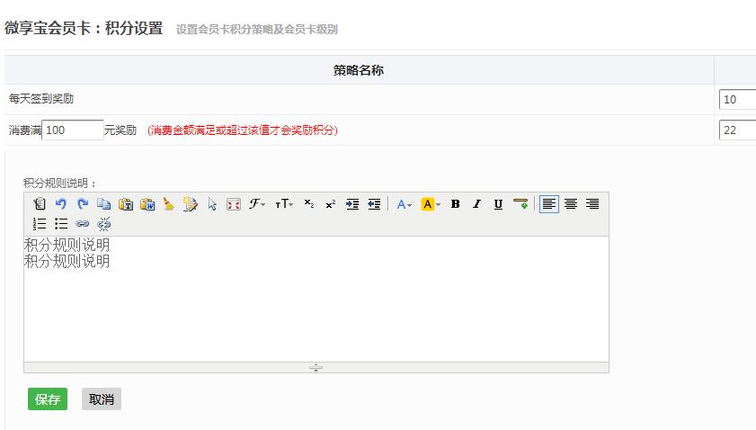 第四步:积分设置,回到会员卡管理页面,点积分设置,设置签到积分奖励和消费1元奖励,填写清楚积分规则说明,保存;然后点会员通知,可以填写会员公告或者近期优惠活动等;充值设置,可以设置充值多少到会员卡然后赠送多少金额