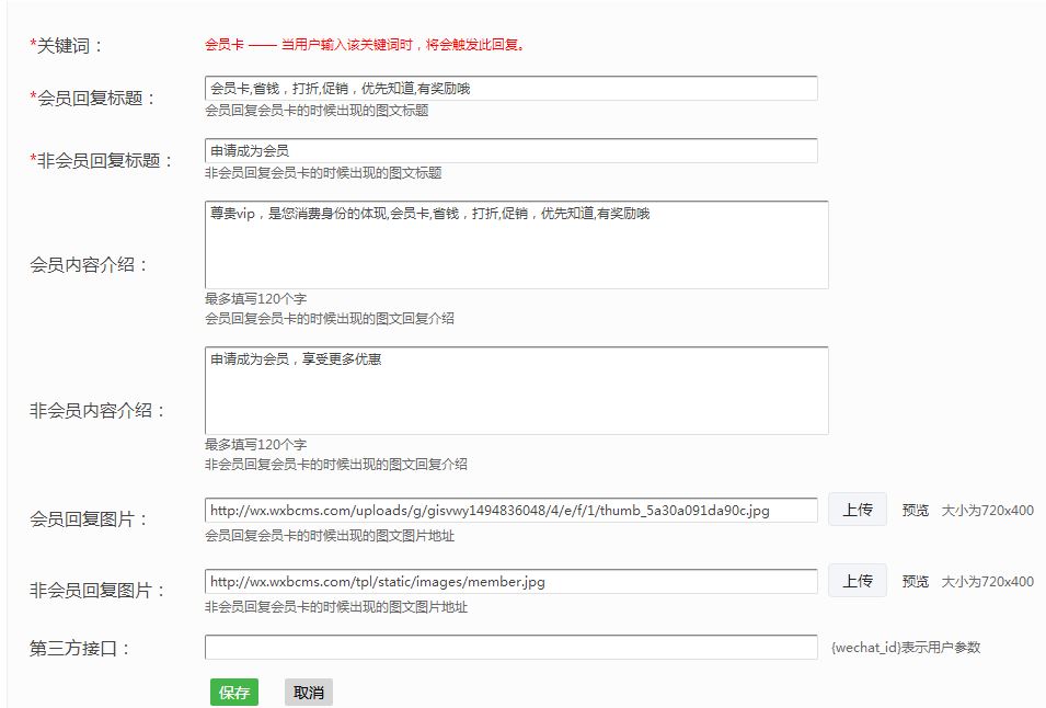 第五步:设置会员卡回复设置,设置好非会员和会员回复关键词会员卡时看到的标题和内容,上传标准尺寸的图片,保存。添加幻灯片,即打开会员卡,首页头部幻灯片,可以添加多张图片,每张图片可以添加相对|应的超链接,幻灯片链接地|址点从功能库添加。