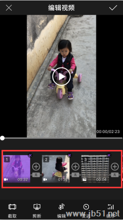 点击片段剪辑,会看到刚刚添加的视频和照片被合成了。选中其中一段视频,点击剪断,把视频分割成3段,找到处于中间的精彩镜头。