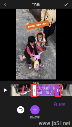 在字幕编辑页点击又上方的确认后,来到了选择字幕持续时间的操作,滑动紫色选取框的两边即可控制。