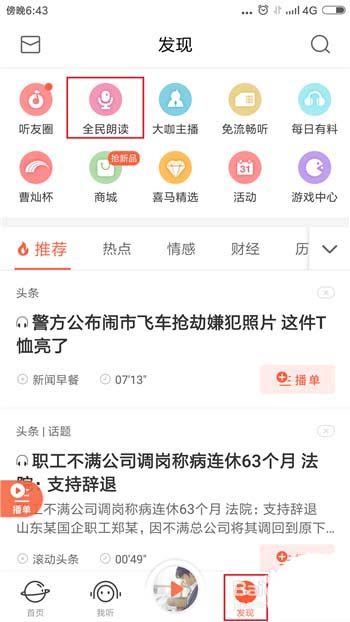 2、在发现界面中找到上方的【全面朗读】选项并点击。