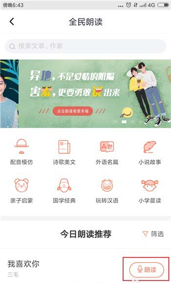 3、任意找一篇文章并点击后面的【朗读】选项。