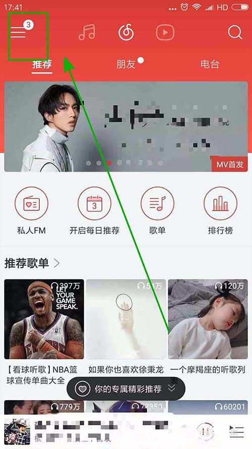 1、我们进入网易云音乐后点击左上角的三条横线,可以进入功能页。