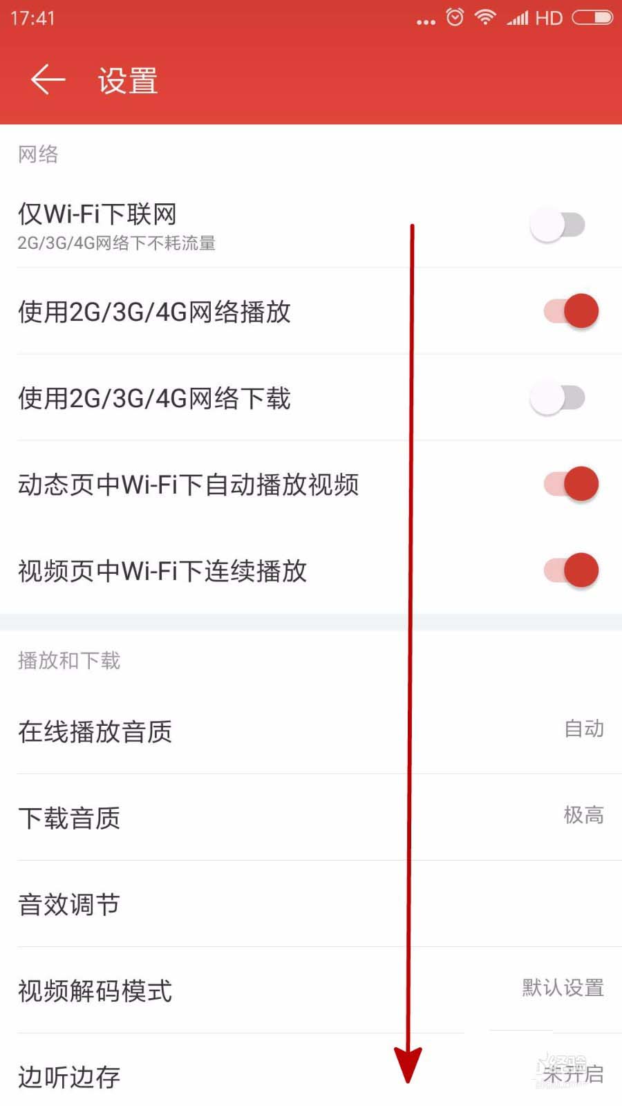 3、在设置界面我们可以对网易云音乐的参数进行设置,主要是使用数据流量和WiFi的一些设置,我们向下拉。