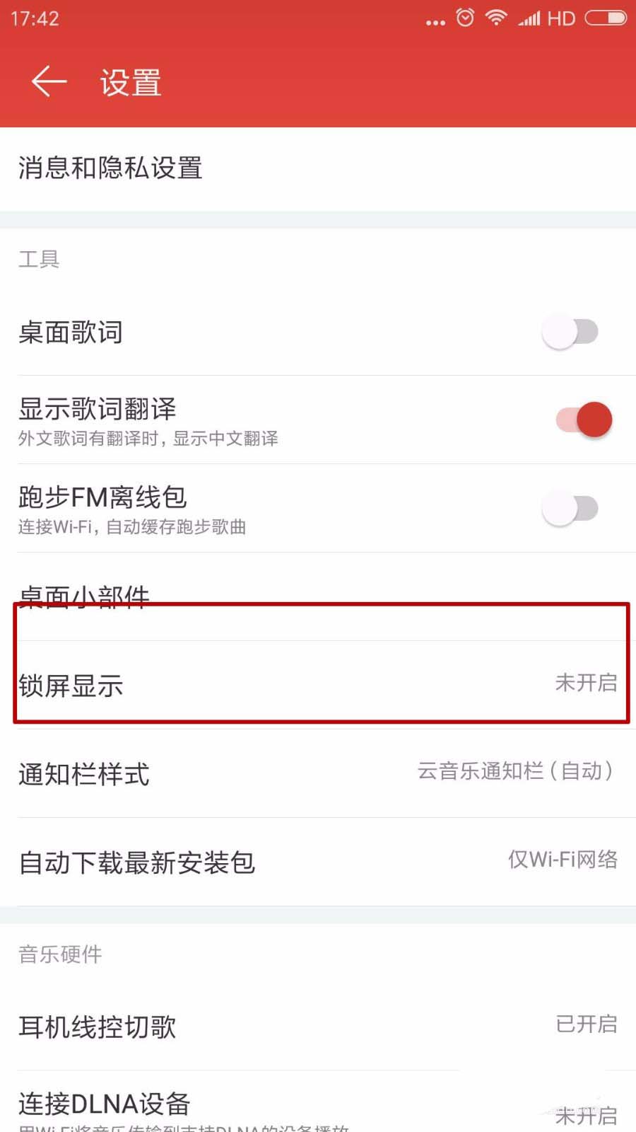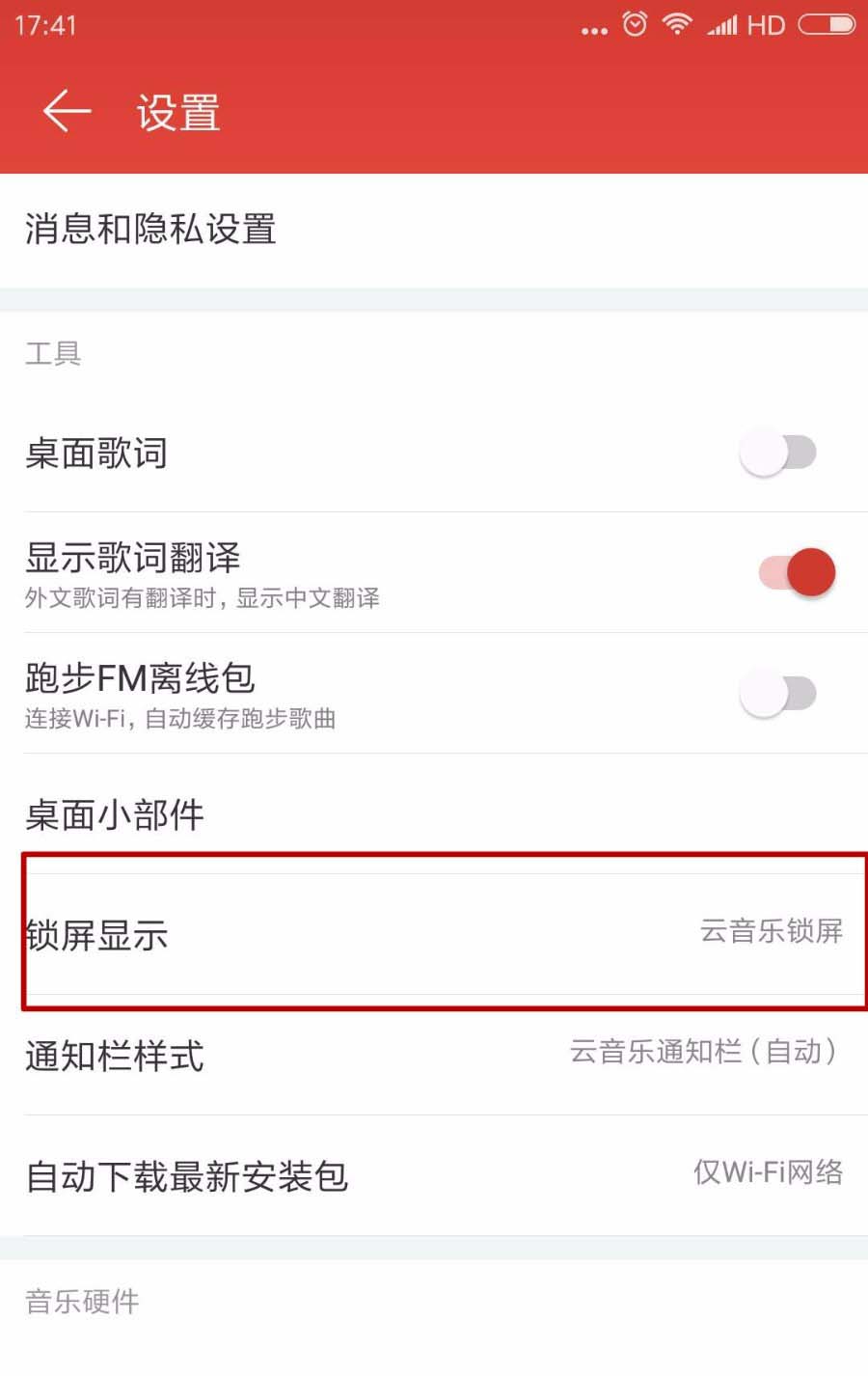 4、向下拉我们可以看到工具里的“锁屏显示”,系统默认的是使用云音乐锁屏,这就是为什么我们的屏保变成了云音乐的缘故。
