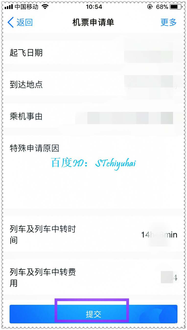4、按机票申请单中一一填写申请信息,注意打*号的为必填选项,填写完成后点击底部提交。