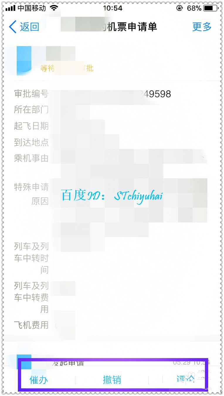 5、可以看到提交的出差机票申请单变成待审批的状态,如果要修改还可以撤回,重新修改后提交。