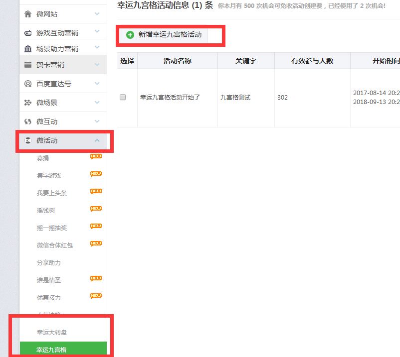 步骤二:后台的分类是已经分好的,接着在平台上选择常规微活动,找到自己喜欢的抽奖游戏进行创建:例如大转盘、九宫格、砸金蛋等等,下面已九宫格抽奖活动为大家做下演示,点击新增幸运九宫格活动,对活动进行制作编辑