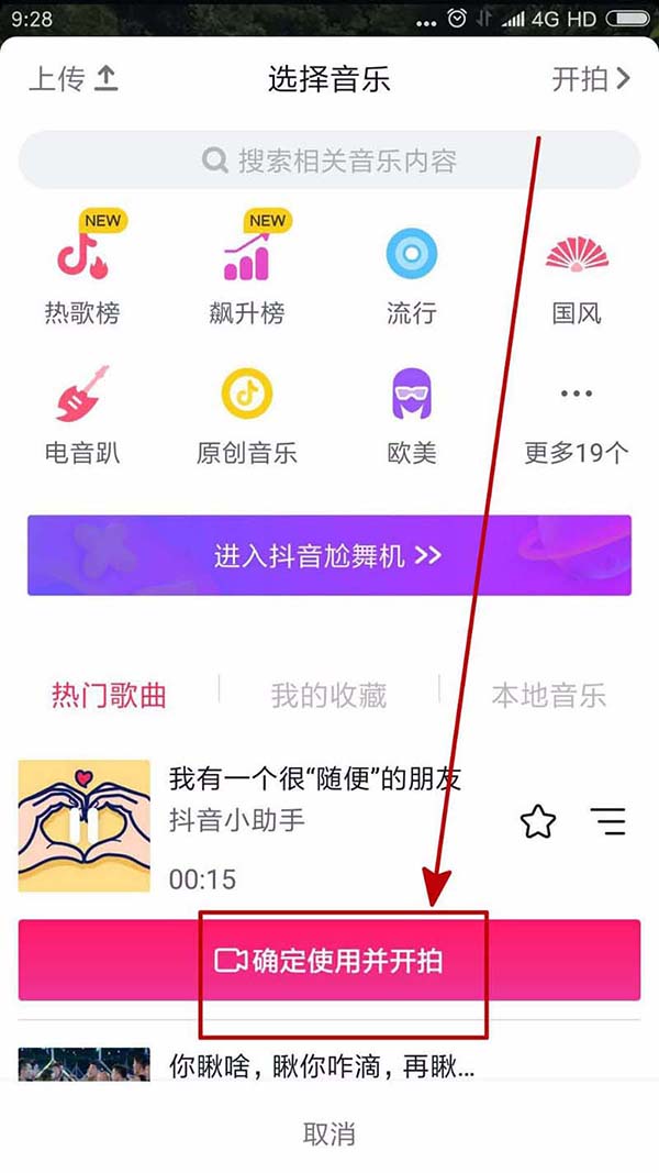 3、找到喜欢的之后点击这个配乐,然后点击出现的“确定使用并开拍”。