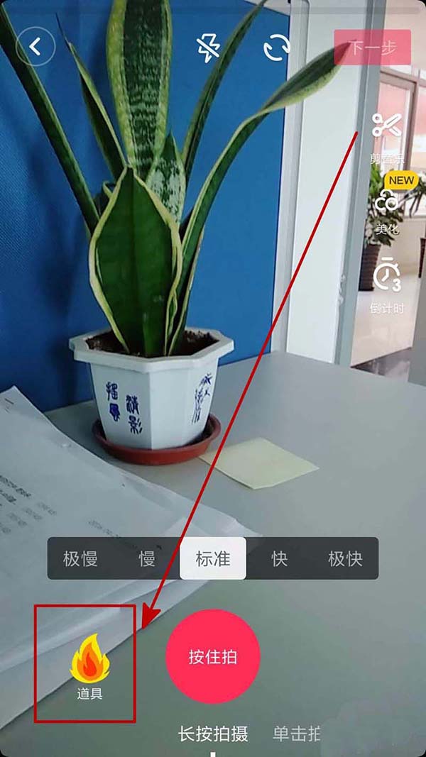 4、然后我们就进入了视频拍摄界面,这里就是关键了,我们可以看到左下角有一个“道具”图标,我们点击这个道具图标。