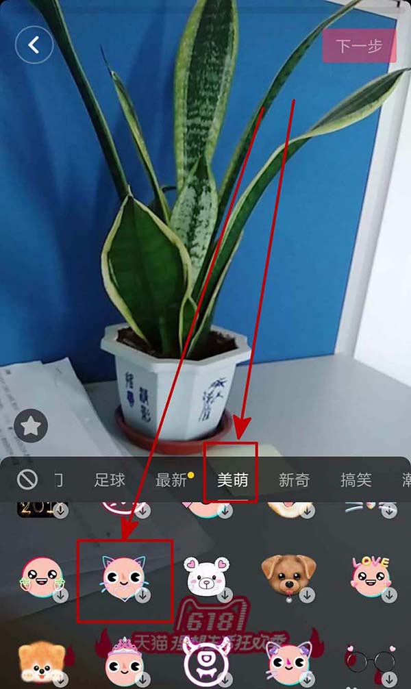 5、点击道具图标后就出现了道具选择界面,我们可以看到很多种类的道具,我们选择“美萌”种类下面的猫儿萌萌哒道具。