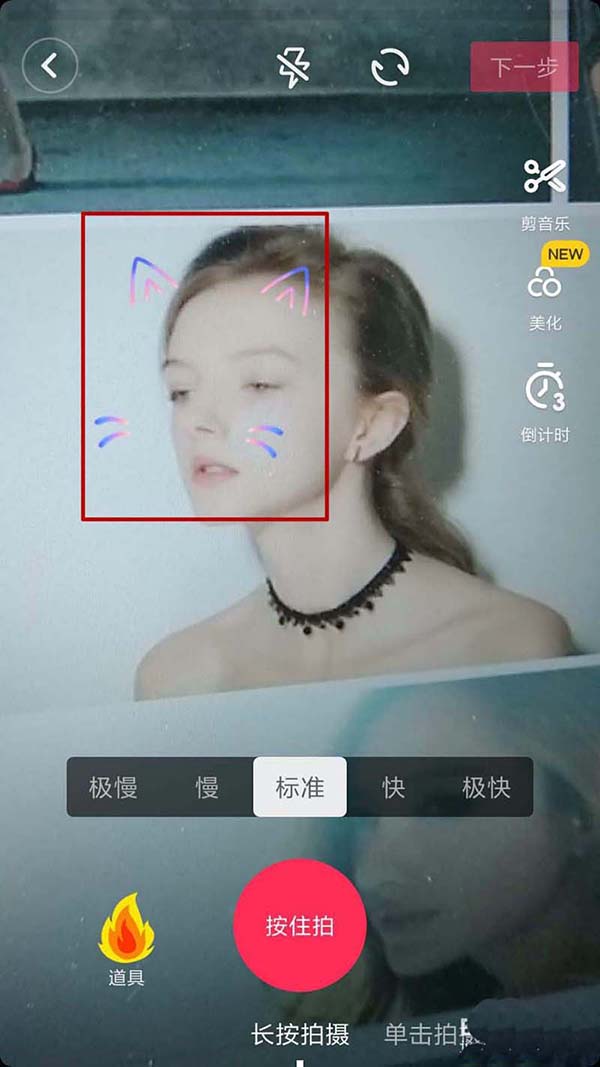 6、这样我们在拍摄视频的时候,系统就能自动识别人脸,自动在人脸上加上猫耳朵和猫胡子的萌萌哒效果。是不是很神奇,快去试一试吧。