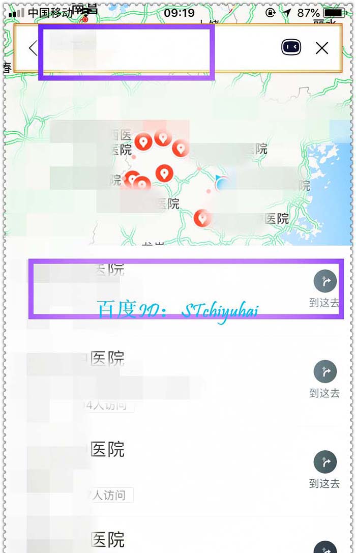 2、解锁手机,打开百度地图App,登陆自己的账户,然后在顶部搜索栏输入要去的地方,在下拉的地址,点击右侧的到这里。