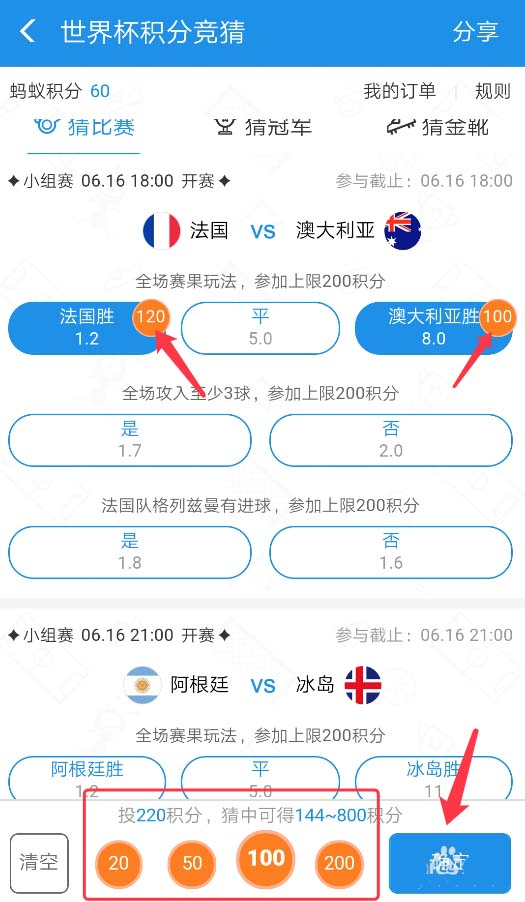 3、首先,先通过猜比赛形式来赢积分吧。在【猜比赛】栏目中,可以看到有多个小组赛,每场赛果玩法,可得20-200积分