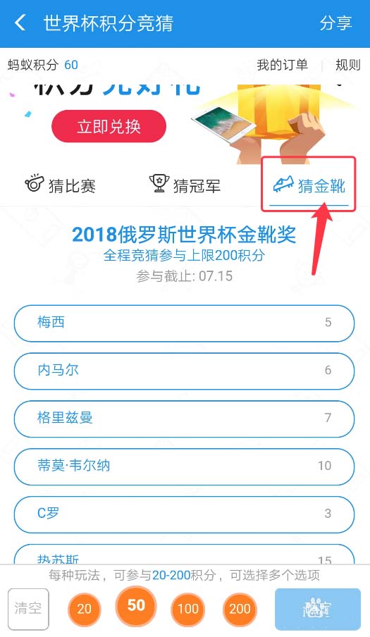 7、最后再来看下如何猜金靴赢蚂蚁积分吧,点击【猜金靴】栏目