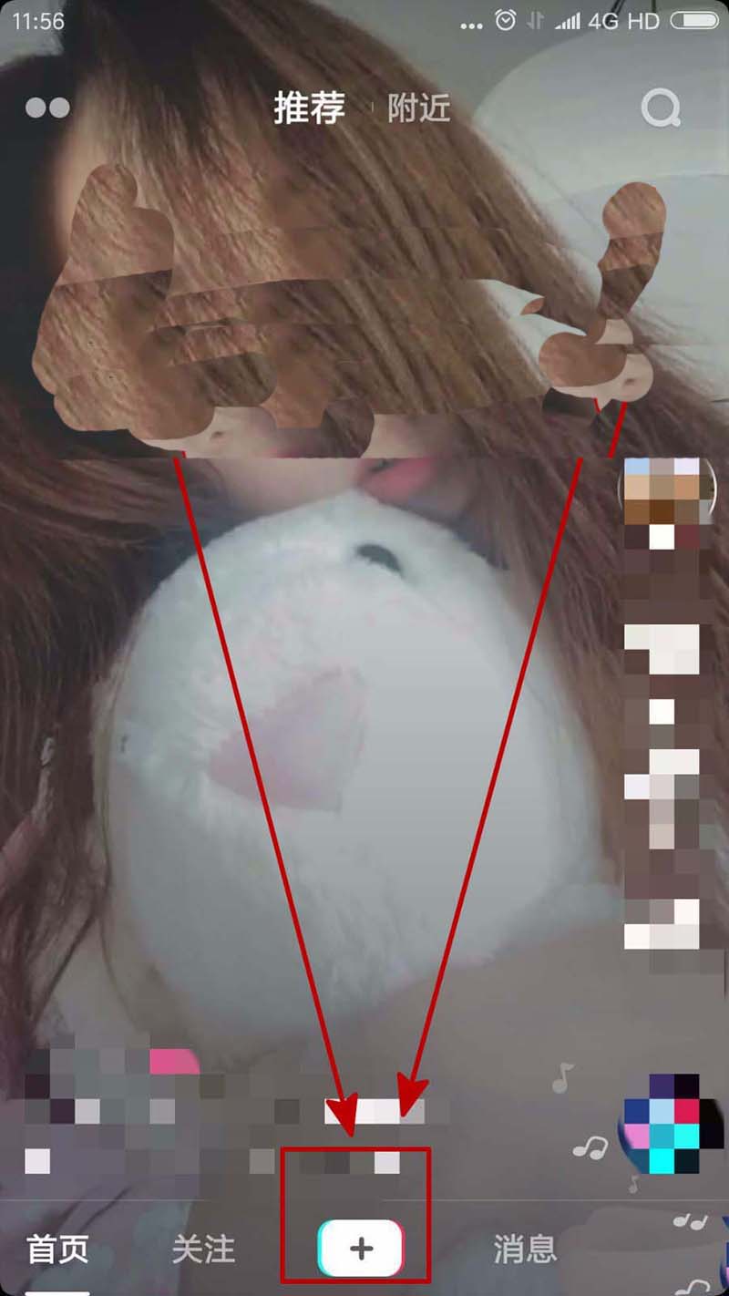 1、我们打开抖音后进入的是默认的推荐页面,我们点击页面底部中间的加号,这样可以进入音乐选取界面。