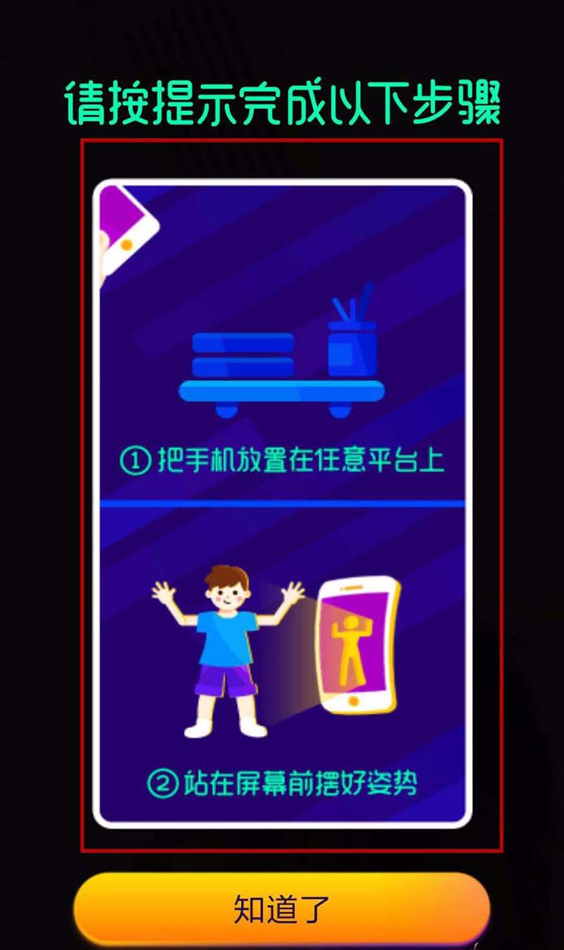 6、配置完成后手机会出来一个操作提示,需要将手机固定在一个位置,然后人在手机屏幕前做出手机上指定的动作。配置好之后点击“知道了”就正式进入了尬舞。