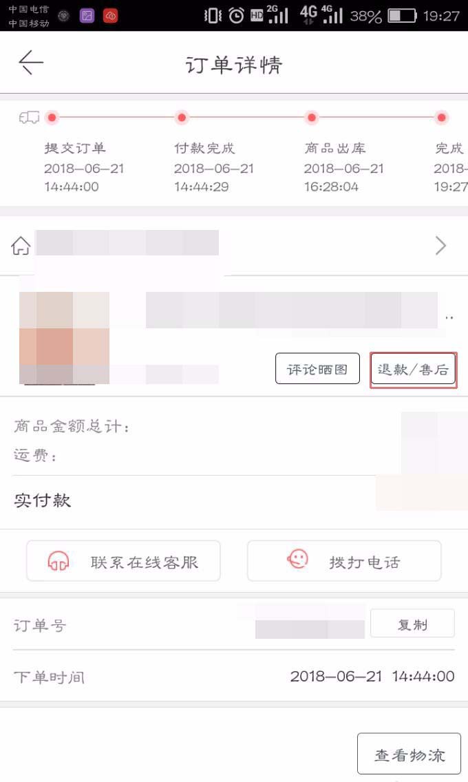 3、确认收货后,点击“退款/售后”。