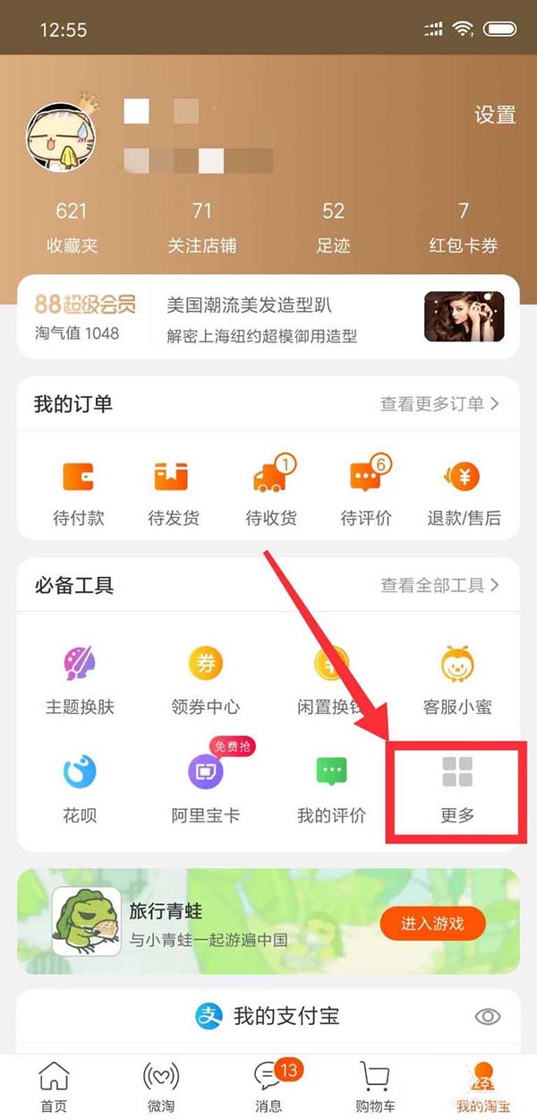1、打开手机淘宝首页,点击右下角的“我的淘宝”,点击必备工具里面的“更多”