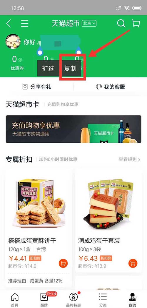 3、在页面上方显示的淘宝会员名上面长按屏幕,在弹出的界面点击复制即可
