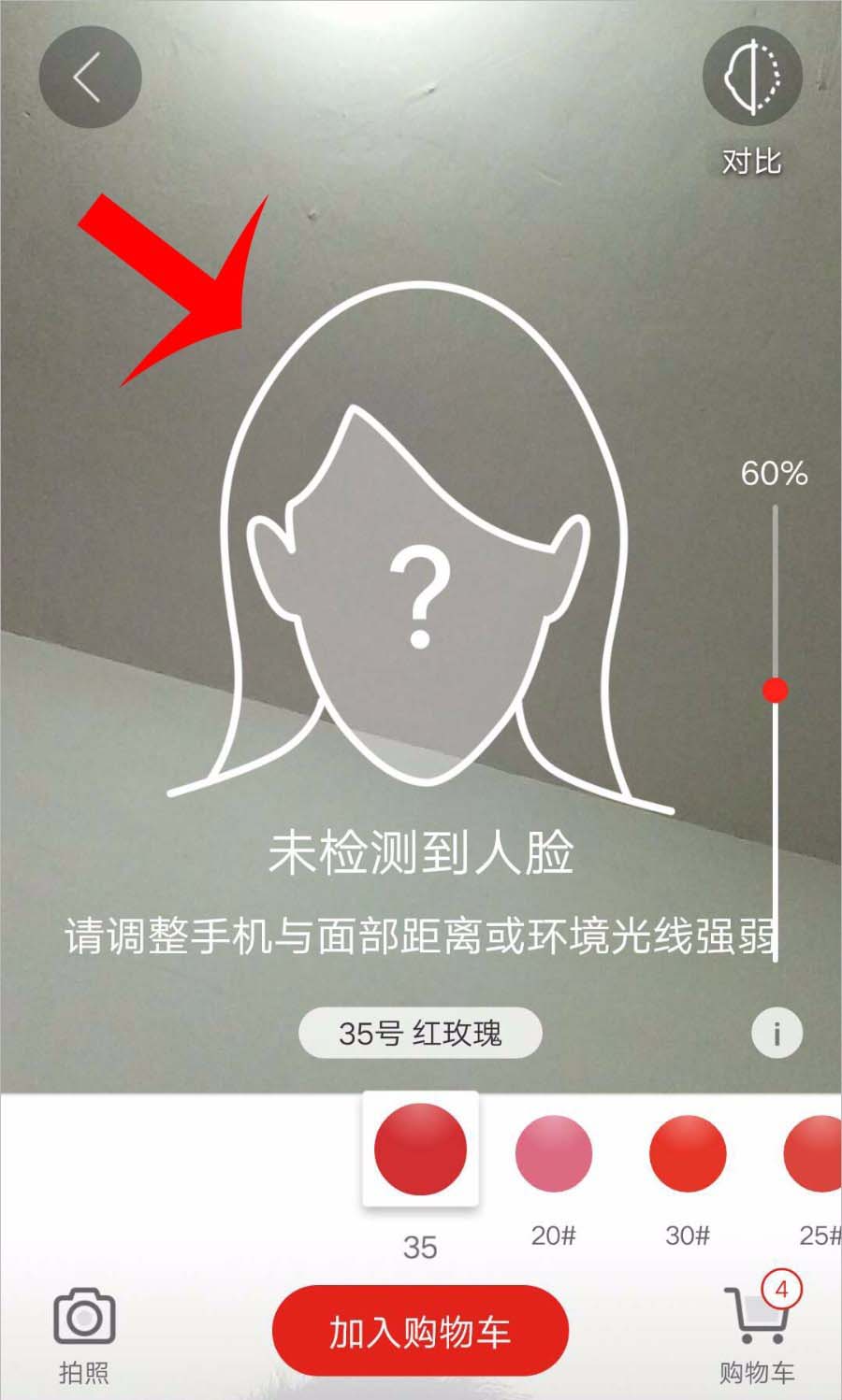 4、打开“AR试妆”功能后,首先看到的是“未检测到人脸”的提示信息,此时,调整手机摄像头与人脸之间的拍摄角度和距离