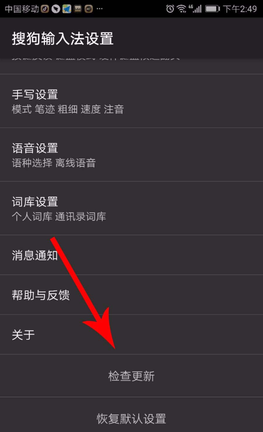 5、如果您的手机输入法中没有这些表情图片该怎么办呢?方法是点击输入法图标,找到“其他设置”后,点击“检查更新”,更新完成后就可以看到这些表情图标了