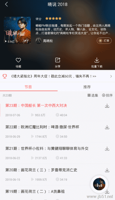 1、用户们想要在蜻蜓fm里调节语速的话,就需要先搜索找到自己感兴趣的节目,点击进入电台节目的详情页面,这里以“晓说”为例子。