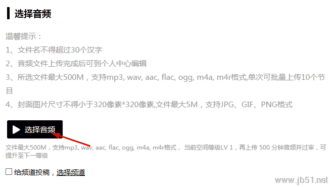 3、了解投稿要求,就可以通过点击“选择音频”进行投稿了。
