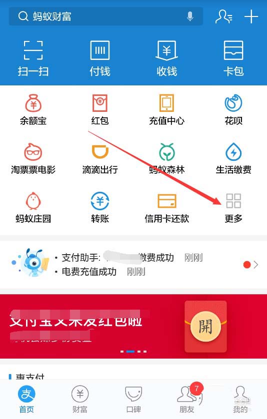 1、打开支付宝并登录,然后直接点击支付宝首界面里的【更多】,如下图所示。