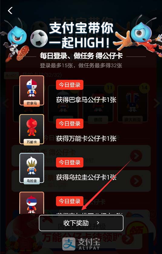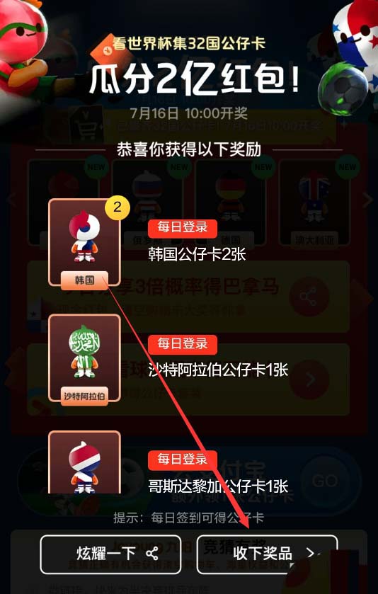 3、每天首次进入支付宝世界杯都会弹出送世界杯公仔卡的提示,直接点击【收下奖励】,如下图所示。