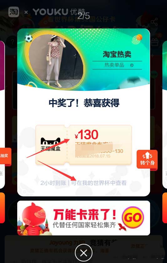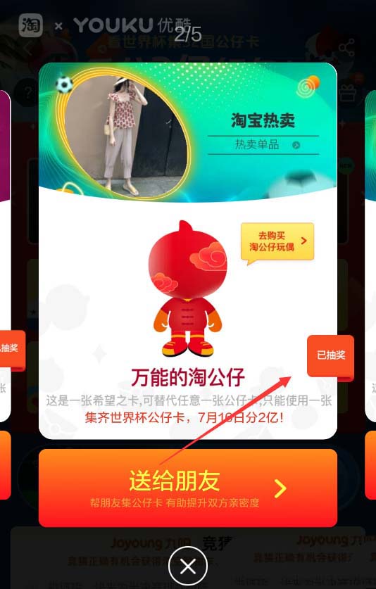 5、同样的每天第一次进入淘宝世界杯都会弹出赠送世界杯公仔卡,直接点击【收下奖励】,如下图所示。